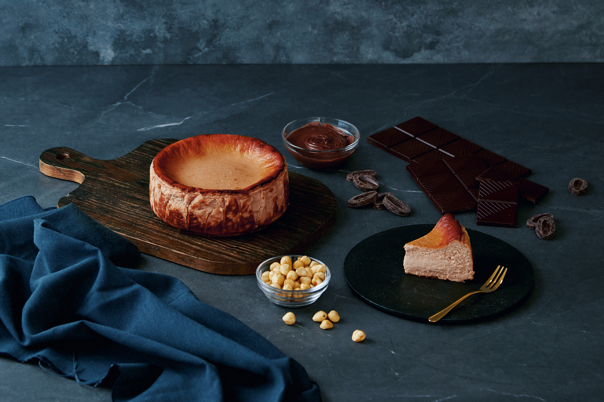 製成榛果巧克力醬化入 Basuku 巴斯克蛋糕的綿密內裡和濃郁流心,
